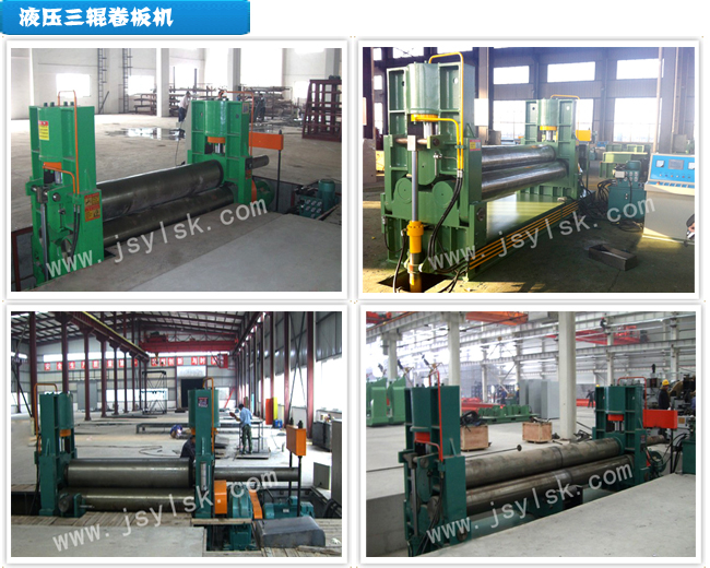 該機結構型式為三輥對稱式,上輥在兩下輥中央對稱位置作垂直升降運動,通過液壓缸內的液壓油作用于活塞而獲得,為液壓傳動,兩下輥作旋轉運動,通過減速機的輸出齒輪與下輥齒輪嚙合,為卷制板材提供扭矩。
