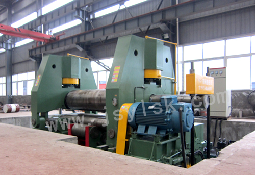 卷板機(jī)上輥在兩下輥中央對稱位置通過液壓缸內(nèi)的液壓油作用于活塞作垂直升降運(yùn)動,通過主減速機(jī)的末級齒輪帶動兩下輥齒輪嚙合作旋轉(zhuǎn)運(yùn)動,為卷制板材提供扭矩。卷板機(jī)規(guī)格平整的塑性金屬板通過卷板機(jī)的三根工作輥(二根下輥、一根上輥)之間,借助上輥的下壓及下輥的旋轉(zhuǎn)運(yùn)動,使金屬板經(jīng)過多道次連續(xù)彎曲,產(chǎn)生永久性的塑性變形,卷制成所需要的園筒、錐筒或它們的一部分。該液壓式三輥卷板機(jī)缺點(diǎn)是板材端部需借助其它設(shè)備進(jìn)行預(yù)彎。該卷板機(jī)適用于卷板厚度在50mm以上的